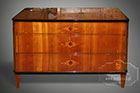 Komoda fornirowana grubą czereśniową okleiną, z wieloma ubytkami forniru. Podczas renowacji trzeba było robić wstawki ze starej okleiny dobierając odpowiednie usłojenie drewna. Również w wielu miejscach musieliśmy dogrzewać spuchnięty fornir odstający od podłoża. Przeważnie w wiekowych komodach podstawowym elementem do wymiany są ślizgi z prowadnicami szuflad. Musieliśmy dokleić listwy ze starego drewna do szuflad i nadłożyć wytarte drewno. Komoda posiadała otwory po aktywnym kołatku, więc trzeba było wykonać dezynsekcję drewna, a następnie je zakitować. Delikatne szlifowanie pod politurę pozwoliło na zachowanie starej patyny drewna. Dzięki temu po ożywieniu drewna uzyskaliśmy piękne usłojenie starej spatynowanej czereśni. Nakładając politurę szelakową wielowarstwowo z dodatkiem naturalnego pumeksu i oleju uzyskaliśmy wysoki połysk, który dodatkowo ożywił piękny gatunek drewna, który z czernionymi dodatkami znakomicie kontrastował. Na fotografiach widoczne są odbicia lustrzane przedmiotów, które były w pracowni w otoczeniu komody. Jest to świadectwo wysokiego połysku mebla. Politurowanie wymaga wielkiej wprawy i umiejętności, oraz wysokiej jakości materiałów.